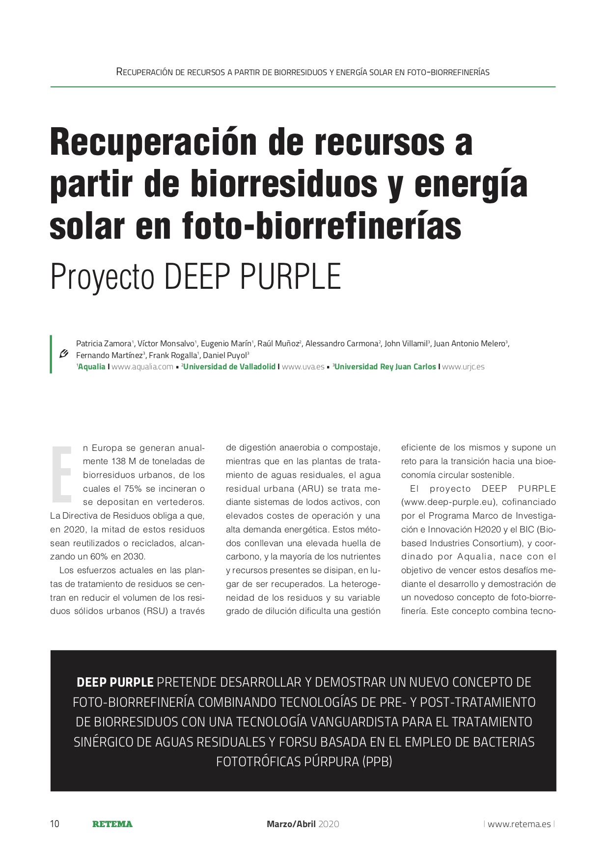 An interesting article in Spanish about the DEEP PURPLE project in the RETEMA Magazine Issue March/April 2020 on “Recovery of resources from biowaste and solar energy in photo-biorefineries” by Patricia Zamora, Víctor Monsalvo, Eugenio Marín, Raúl Muñoz, Alessandro Carmona, John Villamil, Juan Antonio Melero,Fernando Martínez, Frank Rogalla, Daniel Puyol. (Aqualia, Universidad de Valladolid and Universidad Rey Juan Carlos).